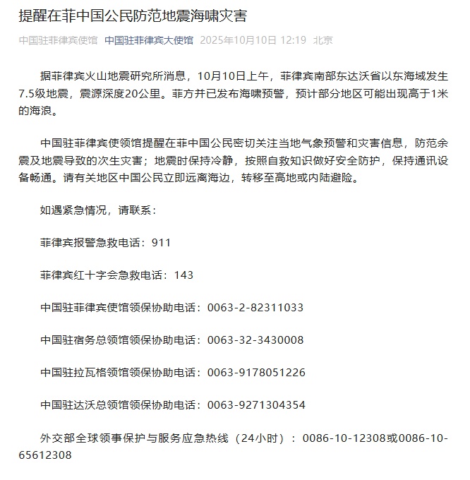 央视网消息:据菲律宾火山地震研究所消息,10月10日上午,菲律宾南部东达沃省东部近海发生7.5级地震,震源深度20公里。菲律宾也发布了海啸警报,称部分地区的海浪可能超过一米。中国驻菲律宾使领馆要求在菲中国公民密切关注当地天气预警和灾害信息,避免因地震引发余震和次生灾害。地震发生时,要保持冷静,遵循自救知识,做好安全防护措施,保持通讯设备畅通。请受影响地区的中国公民立即离开海域,转移至地势较高或内陆地区以确保自身安全。如遇紧急情况,请联系:菲律宾警方紧急热线:911菲律宾红十字会紧急热线:143 中国驻菲律宾使馆领事协助热线:0063-2-82311033 中国宿务总领馆领事协助热线:0063-32-3430008 中国驻拉瓦格总领馆:0063-9178051226 中国驻达沃总领馆领事协助热线:0063-9271304354外交部全球领事保护紧急服务 热线电话(24小时):0086-10-12308或0086-10-65612308