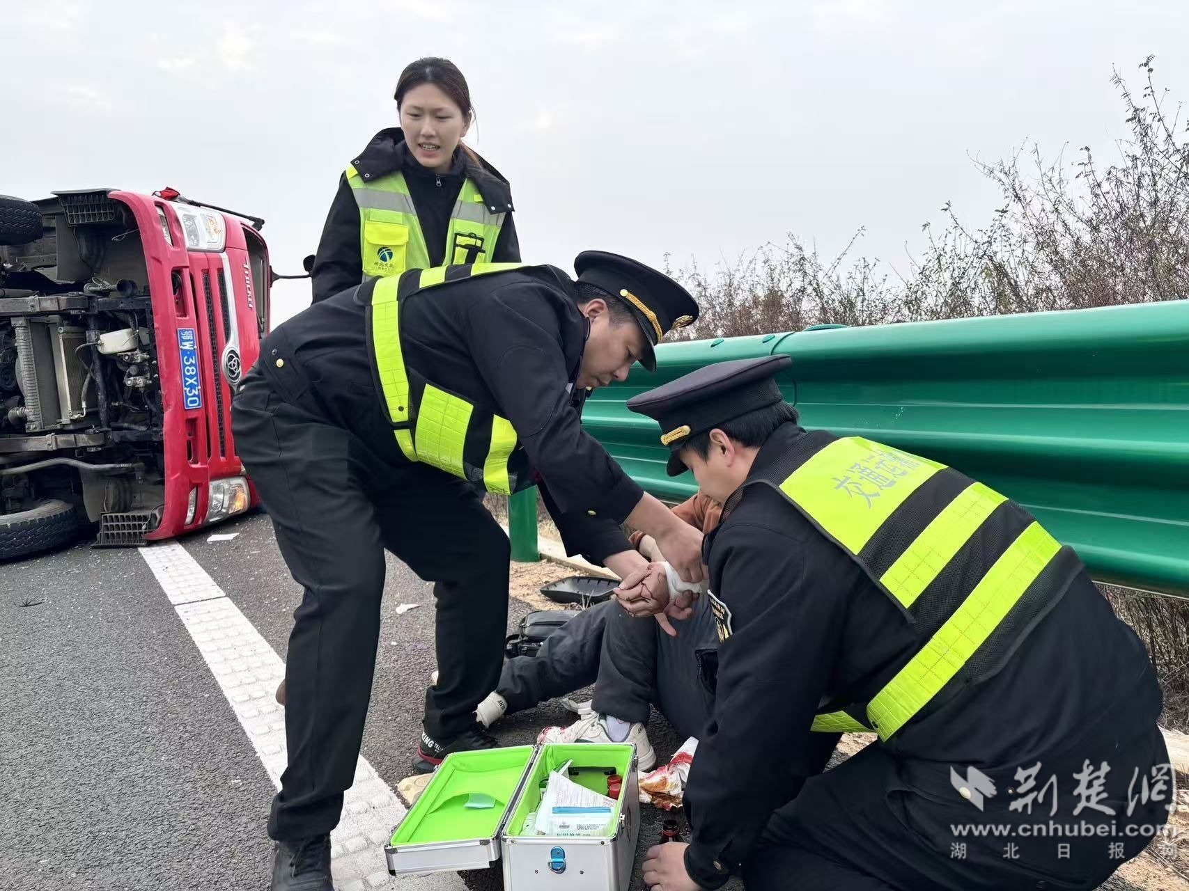 京中网(湖北日报)(张才爱 通讯员 吴天)12月31日14时35分,S4214武虹高速高桥收费匝道上,上演了激动人心的一幕。一辆小卡车失控翻倒。接到报警后,湖北省综合交通执法总队公路执法第三支队第七大队迅速反应,争分夺秒地展开紧急救援。